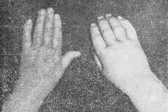 Отечность кисти приводила к значительному снижению движений в фаланговых суставах, отечность плеча и предплечья ограничивала движения в плечевом и локтевом суставах; резко снижалась сила мышц больной руки — до нескольких килограммов по динамометру, а у отдельных больных была равна нулю (рис. 1).