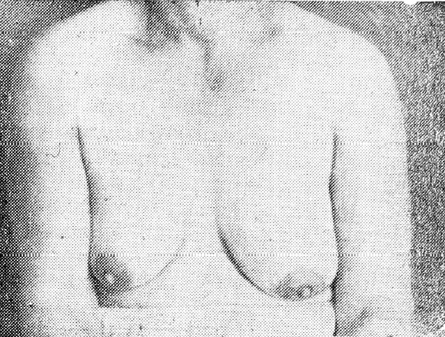 Увеличение молочной железы на стороне поражения звездчатого узла обнаружено у 13 женщин и у 2 мужчин после тяжелых вирусных ганглионитов. Молочная железа увеличивалась обычно диффузно, но у отдельных больных увеличение происходило сегментарно, преимущественно в ее наружно верхнем квадранте. Железа становилась плотной, болезненной. Одна из больных постоянно оттягивала одежду над больной грудью, некоторые поддерживали увеличенную грудь рукою. Длительное увеличение грудной железы сочеталось с изменениями пигментации соска (рис. 2).