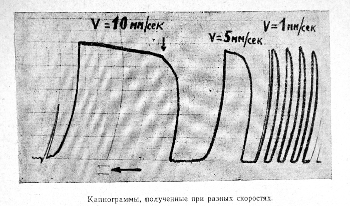В заключение приводим капнограммы одного и того же лица, но записанные при разных скоростях и разном объеме выдыхаемого воздуха (справа налево): 1-я запись—скорость 1 мм/сек.; 2-я— 5 мм/сек.; 3-я— 10 мм/сек.; при этом Объем выдоха больше, поэтому можно легко найти точку начала альвеолярной фазы.