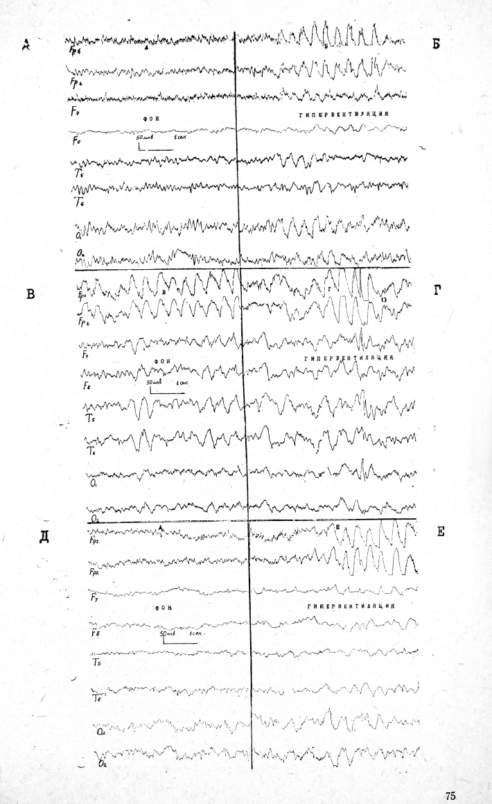 Телосложение атлетическое. АД 150/90, пульс 50—60. Двусторонний симптом Кернита. Анизокория (правый зрачок чуть шире левого). Легкий птоз левого века. Недостаточность отведения глазных яблок кнаружи. Снижение корнеальных рефлексов с обеих сторон. Центральный парез мимических мышц справа, девиация языка влево. Тонус мышц слегка повышен во всех конечностях. Периодически в них возникает мелкоразмашистый тремор; во время припадка — тонико-клонические судороги. Сухожильные и периостальные рефлексы живые, симметричные. Равномерно угнетены брюшные рефлексы. Симптом Оппенгейма и Шеффера справа и Россолимо слева. На глазном дне — вены насыщены, артерии сужены, соски бледно-розовые с четкими границами. На ЭЭГ (см. рис., В—Г) превалирует билатерально-синхронная дельтаактивность, чередующаяся с альфа- и тета-колебаниями. Гипервентиляция увеличивала число и амплитуду медленных волн и вызывала комплексы «пик — медленная волна» неправильной формы.
