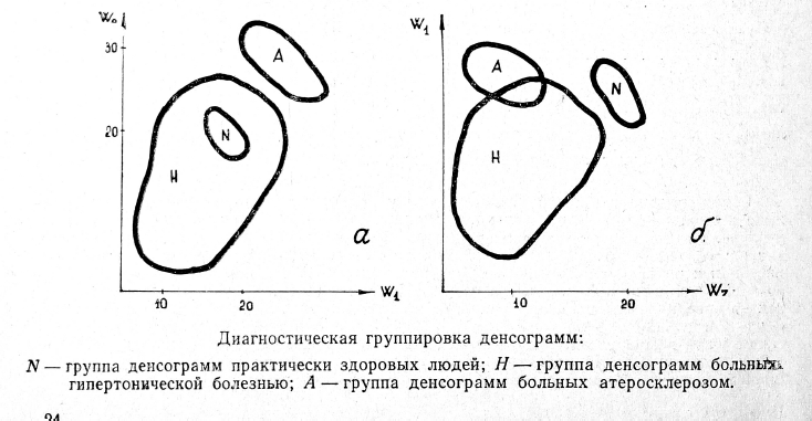 В пространстве признаков Wo, W1 четко различимы 2 области: одну из них (А) составляют точки, отображающие денсограммы больных атеросклерозом, вторую (HUN)—точки, отображающие денсограммы практически здоровых людей и больных гипертонической болезнью (см. рис., а). В пространстве признаков W1, W7 также выделяются две не пересекающиеся друг с другом области: точки одной из них (N) соответствуют денсограммам практически здоровых людей, точки другой (AUH) — денсограммам больных атеросклерозом или гипертонической болезнью (см. рис., б).