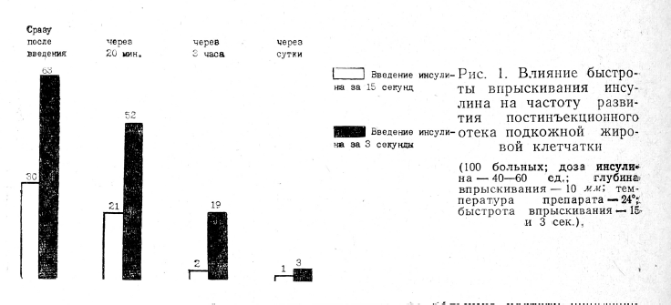 Изучая влияние быстроты впрыскивания, мы сравнили у 100 больных частоту постинъекционного отека в упомянутые сроки при впрыскивании препарата (инсулина) в объеме 1—1,5 мл (40—60 ед.) за 15 и за 3 секунды. Глубина инъекции была 10 мм-,. температура инсулина +24О (рис. 1).