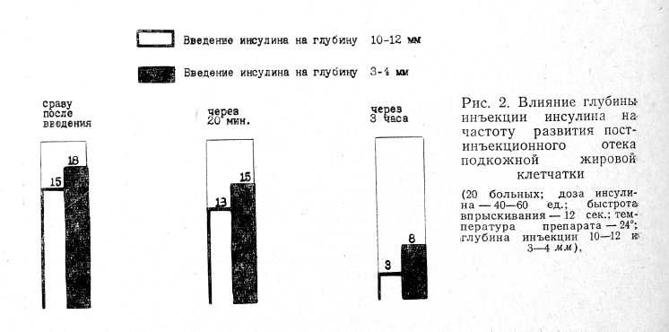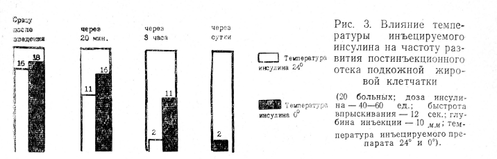 Мы изучали зависимость частоты образования постинъекционного отека и длительности его сохранения от быстроты и глубины впрыскивания и температуры: инъецируемого препарата (инсулина). Наличие отека определялось в зоне инъекции' сразу, через 20 мин., через 3 часа и через 24 часа после введения лекарства.