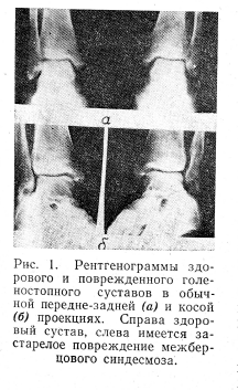 Из других дополнительных методов рентгенологического исследования голеностопного сустава нами применены снимки в косых проекциях, особенно для диагностики застарелых повреждений межберцового синдесмоза и для контроля за процессом срастания отломков лодыжек при динамическом наблюдении. Для диагностики межберцового диастаза производили рентгенографию в косой проекции при ротации голени внутрь на межлодыжечный угол. Как показало обследование по данной методике 45 больных, она дает возможность диагностировать минимальный межберцовый диастаз (рис. 1).