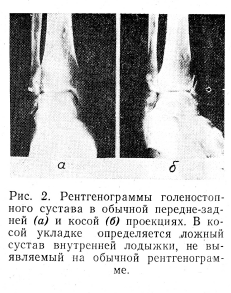 Чтобы выяснить, как идет срастание отломков лодыжек, рентгеновские лучи направляют перпендикулярно к линии излома, причем последняя должна занимать краеобразующее положение. Для этого конечность укладывают с поворотом под углом 140— 145° внутри или кнаружи. Рентгенограммы, полученные в косых проекциях, позволили выявить несросшиеся переломы и ложные суставы, которые на снимках в обычных проекциях не определялись (рис. 2).