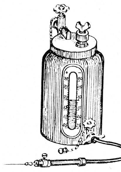 В крышку вмонтирована газопроводная трубка длиной 8 см, на дистальном конце которой имеется запирательный краник. На крышке резервуара расположена и «заправочная» колонка для дополнительной заливки раствора новокаина в аппарат. В нижнем отделе корпуса-резервуара имеется выходной краник, регулирующий перекрытие и силу струи новокаина. На резьбу нижнего краника в период подготовки аппарата к операции привинчивается штуцер шланга. Длина шланга, по которому подается раствор новокаина, равна 1, 5 м, диаметр шланга — 0, 8 см. На дистальном конце шланга расположен наконечник. Наконечник длиной 10 см, регулирующий подачу новокаина в ткани, состоит из трубки длиной 7 см и диаметром 2 см и из головки длиной 3 см и диаметром 2, 5 см. В головке размещен пружинно-клапанный механизм, регулирующий перекрытие струи новокаина. На наружной поверхности головки имеется кнопка пружинно-клапанного механизма. При нажатии пальцем на кнопку осуществляется прохождение струи новокаина из наконечника в иглу и в ткани операционного поля. Перекрытие струи новокаина осуществляется автоматически с момента отнятия пальца с кнопки. Пружинно-клапанный механизм прост по устройству и состоит из кнопки со штоком, клапана и спиральной пружины. Стерилизация аппарата осуществляется методом автоклавирования и кипячения. Перед стерилизацией аппарат легко и быстро разбирается: отвинчиваются шланг от нижнего краника и крышка резервуара. При подготовке аппарата к операции 2/з резервуара заливаются раствором новокаина. Зарядка сжатым газом до 6 атмосфер осуществляется, как указано выше, от самых различных источников нагнетания сжатого газа.