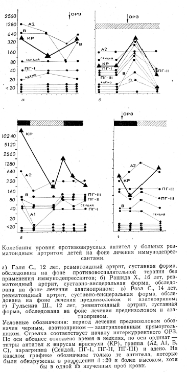 Таким образом, у больных ревматоидным артритом детей, получающих гормональные препараты, снижена способность продуцировать антитела к ряду вирусных антигенов как при наслоении интеркуррентной вирусной инфекции, так и при активации латентной «эндогенной» инфекции. Подобного снижения не выявлено у больных, леченных азатиоприном или лейкераном.
