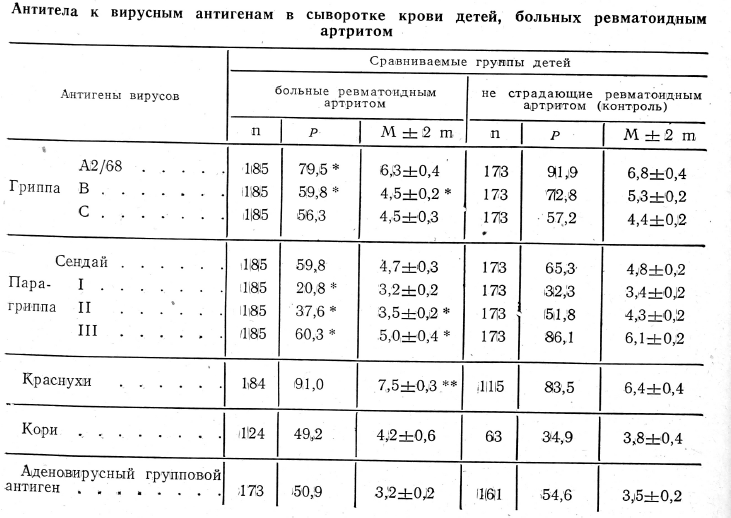 У 136 детей с ревматоидным артритом, в том числе у 50 — в динамике лечения, проведено исследование сыворотки крови на антитела к вирусам краснухи, гриппа, адено и парагриппа. Гиперпродукция антител к вирусу краснухи выявлена у больных ювенильным ревматоидным артритом наряду со сниженными по сравнению с возрастной нормой титрами антител к вирусам гриппа В, адено и парагриппа типов 2 и 3.