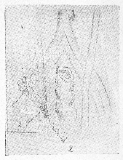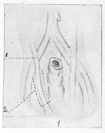 Тихов погружает мочеточник в просвет кишки на 1/2 см и таким образом укрепляет его. Разные авторы пользуются различными модификациями при погружении мочеточников в кишку. Гуревич, указаниями которого я руководствовался при вшивании конца мочеточников в кишку, поступает таким образом: берет кетгутовую нить, на оба конца которых вдеты круглые кишечные иглы, и проводит нитку через дистальный конец мочеточника, прокалывая только серозный и мускульный слои мочеточника (рис. 1). Затем проводится одна иголка через отверстие, сделанное в кишке, и выкалывается в каудальном направлении на расстоянии приблизительно 3/4—1 см от отверстия, сделанного в кишке1).