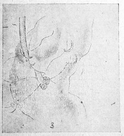 Технически операция очень проста. Катетеризированный мочеточник (можно обойтись и без катетеризации мочеточника) очень легко приподымается с брюшиной 2 пальцами и разрезы брюшины проводятся с обеих сторон мочеточника, как показано на рисунке. Затем мочеточник на необходимом уровне перерезается между 2 лигатурами, после чего накладывается тонкий непрерывный кетгутовый шов на края брюшинной манжетки вокруг мочеточника (рис. 3). Дефект в брюшине тоже закрывается непрерывным швом. В остальном операция проводилась как и в первом случае. Больная, девочка 10 лет, выздоровела.