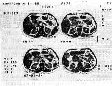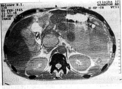 Множественные метастазы печени (4 набл.) довольно точно устанавливались как с помощью УЗИ, так и РКТ. Для выявления первоисточника после УЗИ или РКТ проводилось рентгенологическое обследование пищеварительного тракта. Диффузные поражения печени — гепатиты, циррозы (27 набл.) не имели патогномоничных признаков при УЗИ и РКТ.