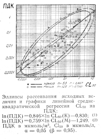 В качестве материалов для статистического анализа были взяты экспериментальные данные по обоснованию ПДК, полученные в разных лабораториях страны, но с учетом методических требований секции ПДК М3 СССР. Обработку материалов проводили на ЭВМ «Наири». Уравнения регрессии рассчитывали методом наименьших квадратов. В качестве границы рассеивания исследовали кривую равных вероятностей
