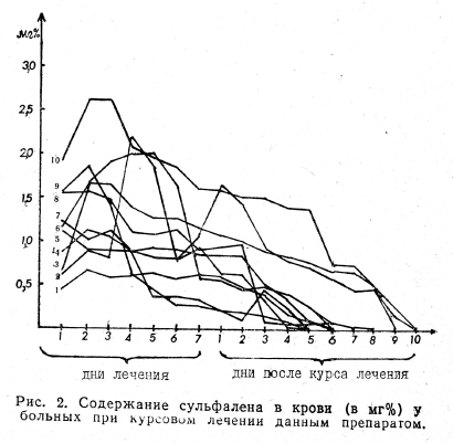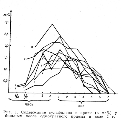 Под наблюдением находились 20 больных, страдающих хроническими неспецифическими инфекционно-воспалительными заболеваниями бронхолегочного аппарата. У половины пациентов определяли сульфален в крови и моче через различные промежутки времени после однократного перорального приема 2 г препарата, у остальных 10 больных фармакодинамику сульфалена изучали на протяжении 7-дневного курса, а также по окончании его. Концентрацию сульфалена в указанных биосубстратах исследовали по методу Пребстинг и Гаврилова в модификации Л. И. Гребенника (1959).