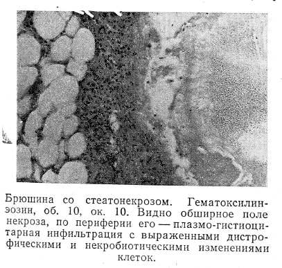 Все изложенное выше позволяет наметить пути рациональной хирургической тактики при панкреонекрозах, осложненных разлитым ФП. Последний, наряду с нарастающей желтухой и деструктивным поражением желчного пузыря, является одним из показаний к экстренной операции при панкреатите.