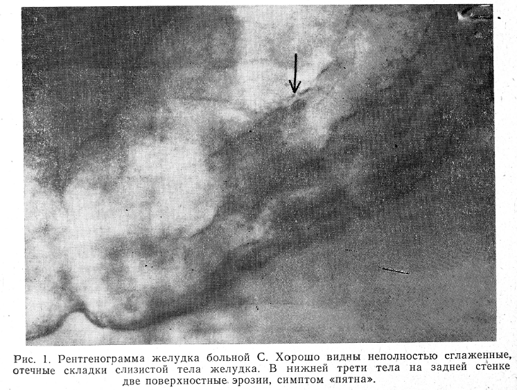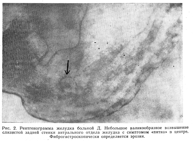С., 41 г., поступила на стационарное обследование по поводу болей в эпигастрии. При рентгенологическом исследовании двуконтрастной методикой на снимке выявлены 2 пятна размерами 2 мм, расположенные на задней стенке средней трети тела желудка. Заключение: эрозия тела желудка (рис. 1). Произведена гастрофиброскопия, обнаружены 2 эрозивные поверхности без заметных реакций окружающих тканей. Заключение: эрозивное поражение слизистой задней стенки тела желудка. После курса лечения С. выписана, жалобы отсутствуют.