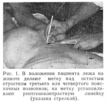 У пациента в положении лежа на животе находят уровень оттистого отростка 3-го или 4-го поясничного позвонка и делают на коже чернилами метку (рис. 1). На эту метку углом устанавливают линейку, представляющую собой соединенные имеющие сантиметровые деления (на рис. 1 линейки кладут свободным концом на вышерасположенные остистые отростки, другой стержень свободным концом обращен в левую сторону пациента. С закрепленной в этом положении линейкой пациенту делают рентгеновские снимки поясничной области в двух взаимно перпендикулярных проекциях (в прямой и боковой).
