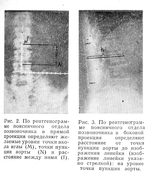 На рентгенограммах поясничного отдела позвоночника отчетливо получается изображение линейки, которое по рентгенограмме в прямой проекции (рис. 2) позволяет точно наметить и рассчитать, на каком расстоянии находятся желаемые уровни точки вкола иглы (М) и точки пункции аорты (N) от нанесенной на коже пациента метки, а также определить расстояние (0 между уровнями точки вкола иглы и точки пункции аорты (рис. 2).