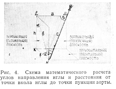 Значения тангенсов находят по таблице В. М. Брадиса. По формуле С2=а2+Ь2 рассчитывают расстояние от точки вкола иглы до точки пункции аорты, одно из необходимых условий для осуществления транслюмбальной пункции аорты.