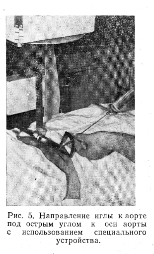 Для продвижения иглы к аорте точно по рассчитанным углам и обеспечения пункции аорты на желаемом уровне нами разработано и сконструировано устройство, которое снабжено направителем для иглы, транспортирами для регистрации углов направления иглы, специальным приспособлением— платой для крепления всего устройства к рентреновской трубке. Устройство позволяет осуществлять как верхнюю, так и нижнюю транслюмбальную пункцию аорты, т. е. игле можно придать относительно оси аорты как краниальное (рис. 5), так и перпендикулярное направление. Например, если решено произвести вкол иглой на расстоянии 9 см от остистых отростков (а = 9 см), по боковой# рентгенограмме установлено, что расстояние от кожи над остистыми отростками до аорты на уровне точки пункции аорты составляет 10 см (h = 10 см), а по рентгенограмме в прямой проекции определено, что намеченный уровень точки пункции аорты располагается от уровня точки вкола иглы на расстоянии 5 см (f = 5 см), то на месте пересечения в таблице значений a, h и f находим, что расстояние (С) от точки вкола иглы до точки пункции аорты составляет 14,35 см, угол ß1 = 38°50z, а угол а=26о34'.