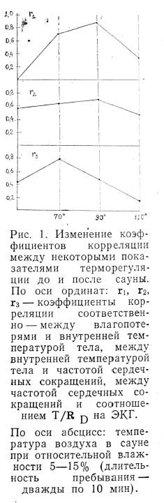 Гигиенической оценке подвергались следующие параметры сауны; относительная влажность воздуха 5—15% и 60—80%; температура воздуха 70, 90 и 110°С; температура воды во время охлаждающей процедуры 10 и 17°С. Длительность пребывания в горячем помещении сауны на всех этапах исследования. — трижды по 10 мин с 5-минутным перерывом. После каждого теплового воздействия применяли дающую процедуру в течение Скорость движения воздушных сауне составляла 0,2—0,3 м/с.