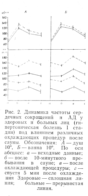 Однако у лиц с повышенным АД во время приема контрастной ванны с температурой воды 10°С (после 2-кратной по 10 мин экспозиции при температуре 70 и 90°С) наблюдалось более значительное увеличение систолического давления и учащение сердечного ритма, чем во время душа той же температуры, а также более существенная динамика рассматриваемых показателей по сравнению с группой здоровых испытуемых (рис. 2). Это свидетельствует о необходимости менее контрастного охлаждения после температурного воздействия в сауне для больных гипертонической болезнью 1 стадии: предпочтительнее и безопаснее принимать прохладный душ с температурой воды 17—20°С, чем контрастную холодную ванну. Данный аспект методики имеет особую важность, так как в литературе имеются указания, что сауну можно применять в качестве гипотензивного средства [6].