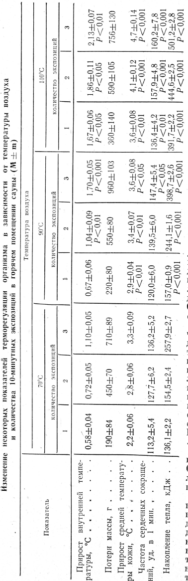 Наиболее важные данные исследования приведены в таблице. Из нее видно, что повышение температуры воздуха в горячем помещении сауны с 70 до 110°С при стабильности уровня относительной влажности (5—15%) приводит к чрезмерному возрастанию внутренней температуры тела и, несмотря на прогрессирующие влагопотери и интенсивное потоиспарение, накопление