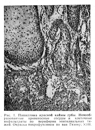 Проведено сравнительное изучение характера морфогистохимических изменений сосудов стромы при папилломах (20 наблюдений) и плоскоклеточном раке красной каймы нижней губы (123).