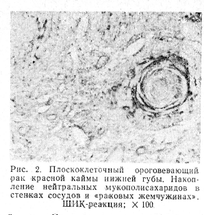 В глубоко лежащих слоях стромы ороговевающего рака сосуды имеют неправильную форму и выстланы эндотелиальными клетками с веретенообразными ядрами. Сосудистая стенка проявляет слабую метахромазию при окраске толуидиновым синим с pH красителя 4,8, но интенсивно окрашивается по методу Мак-Мануса в розовый цвет. Описываемая картина характерна и для сосудов соответствующих участков стромы неороговевающей формы рака.