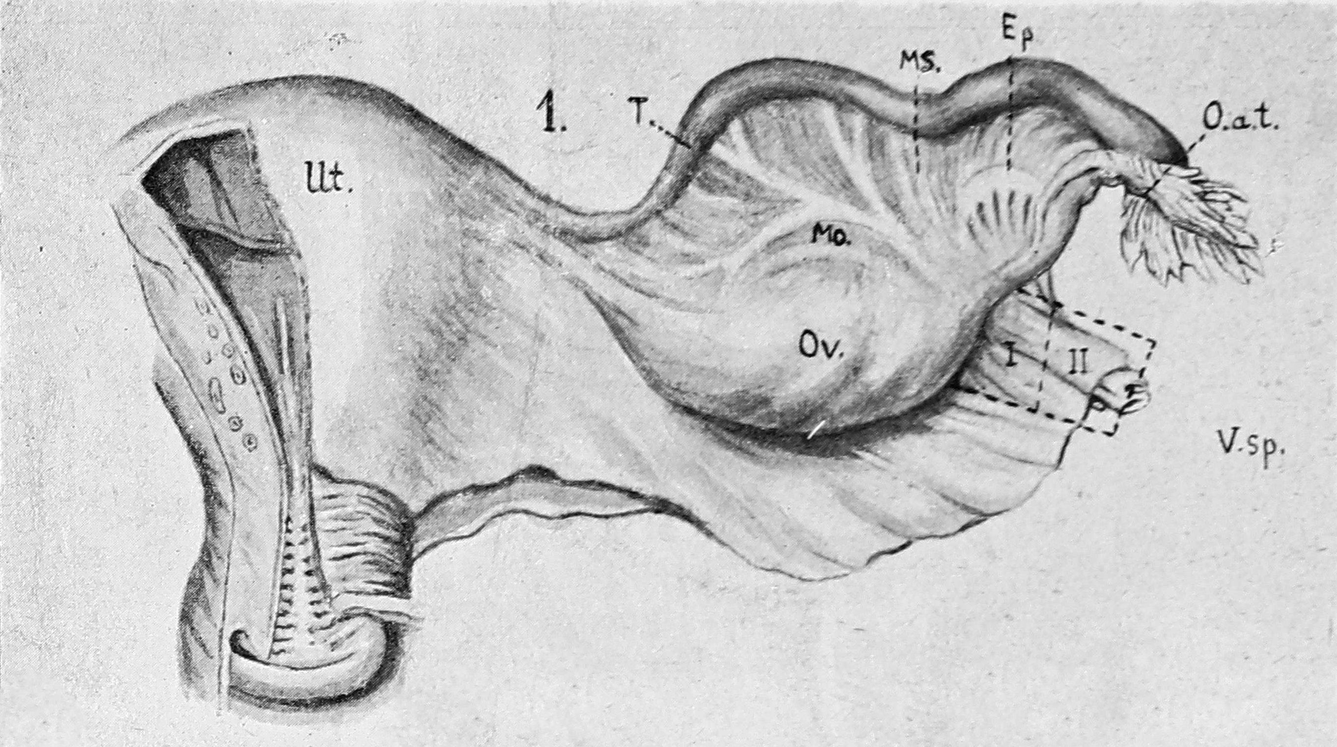 Ut. — матка. Т. — фаллопиева труба. О. a. t. — абдоминальное отверстие трубы. Оv. — яичник. Ms. — мезосальпинкс. Мо. — мезоварий. Ер. — epoophoron. V. Sp. — внутренние семянные сосуды. I и II — схематическое изображение области локализации paroophoron’a.