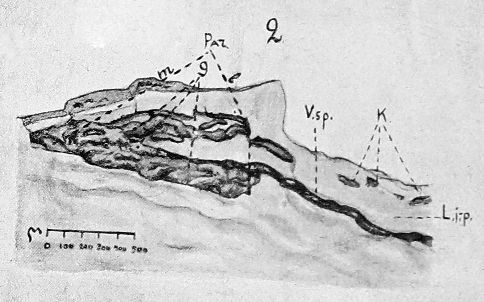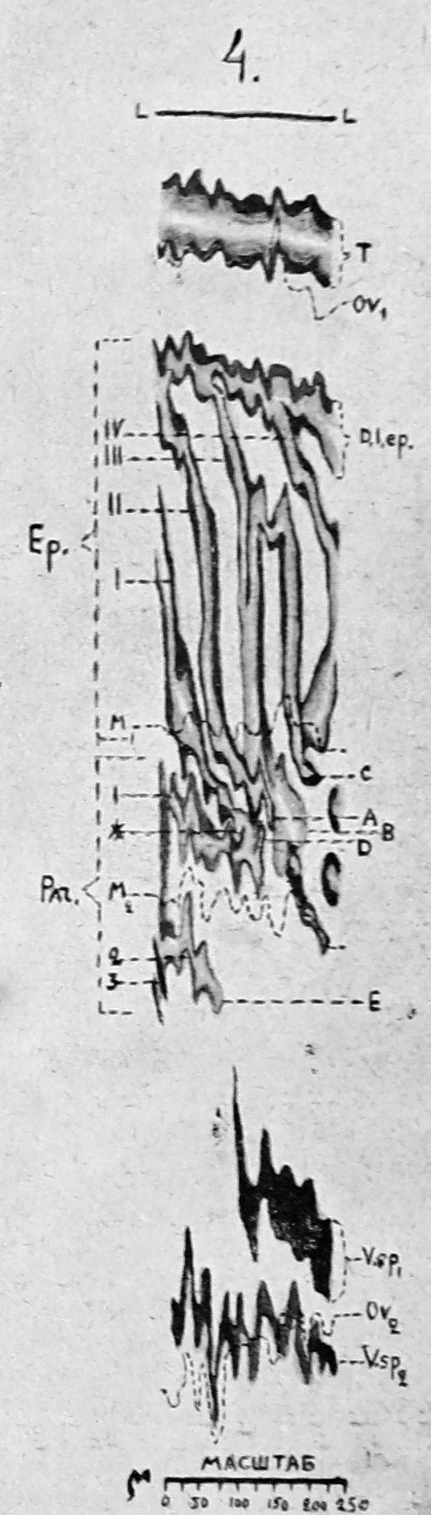 L.L. — верхушка lig. lati. Т. — фаллопиева труба. Оv1 и Оv2 — контур яичника. Ep. — epoophoron (D. l. ер. — ductus longitudinails, I, II, III и IV — ductuli transversi). Par. — paroophoron (1, 2 и 3 — канальцы paroophoron’a, клубочки же не реконструированы). Ж — место слияния I эпоофорального и I пароофорального канальцев. А, B, С, D и Е — слепые концы канальцев. М1 и М2 — линии прикрепления листков мезовария к lig. latum. V. Sp1 и V. Sp2 — ветви внутренних семянных сосудов.
