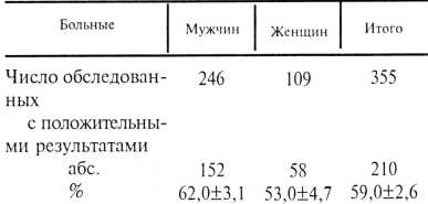 Были обследованы 355 больных гастроэнтерологического отделения Набережно-Челнинской городской больницы № 2 со следующими заболеваниями ЖКТ: язвенная болезнь ДПК (у 214), язвенная болезнь желудка (у 49), гастрит (у 36), гастродуоденит (у 25), холецистопанкреатит (у 22), колит (у 6), рак желудка (у 3). Данные обследованных больных и результаты изучения инфицированности их Нр в зависимости от пола представлены в табл. 2.
