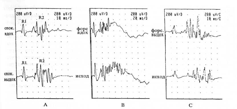 Объемно-временные параметры дыхательного цикла изучали с помощью компьютерного анализатора дыхания “АД-02” (“Медфизприбор”, Казань). Определяли дыхательный объем (Vt), частоту дыхательных движений (f) , минутный объем дыхания (V), время вдоха и выдоха (Ti, Те), фракционное время вдоха (Ti/Ttot), общее время дыхательного цикла (Ttot). Динамику рефлекторных ответов оценивали не только при спокойном дыхании, но и на фоне выполнения обследуемыми маневра в виде форсированного вдоха и выдоха. Кроме того, всем пациентам производились пробы с резистивной нагрузкой и произвольной гипервентиляцией. При этом резистивное сопротивление создавали в обе фазы дыхания с помощью специальной диафрагмы, встроенной в трубку Флейша. Гипервентиляционную пробу ставили в течение одной минуты. Во время выполнения данных дыхательных проб рефлекторные ответы регистрировали каждые 10—12 секунд последовательно в обе фазы дыхания.
