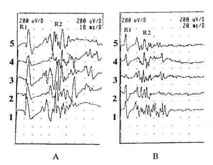 При спокойном дыхании электрическая стимуляция надбровья в проекции выхода надглазничного нерва вызывала в круговых мышцах глаза рефлекторные разряды, состоящие из двух компонентов: раннего (R1), дисинаптического и позднего (R2), являющегося по своим характеристикам полисинаптическим (рис. 1 А). Латентные периоды R1 и R2 составляли соответственно в среднем 9,8 мс и 40,7 мс.