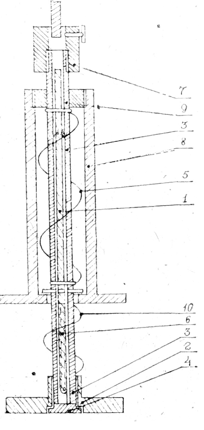 С помощью прибора устанавливали амплитуды деформации связки или мышцы (в мм) при определенной силе (в кг) давления стерший прибора. Прибор имеет шток (1), соединенный с опорной площадкой (2), позволяющий передавать перемещения опорной площадки и щупа по отношению друг к другу. Щуп (3) с резиновым наконечником (4) погружают в толщу мышцы или прижимают к поверхности связки под влиянием пружины (5), заключенной в кожух (6). Сила сжатия пружины определяется по шкале (7), нанесенной на корпус щупа в верхней части. Сжимаясь, пружина выдвигает щуп и погружает его в мышцу или прижимает к связке, при этом опорная площадка остается на поверхности мышцы, связки. Разница уровней передается штоку, свободно перемещающемуся в прорези (8), вверх к втулке (9) с укрепленными на ней измерительными приборами или передаточным устройством линейных перемещений (часовой индикатор, резистор и пр.). Пружина (10) служит для возврата опорной площадки к исходному уровню.