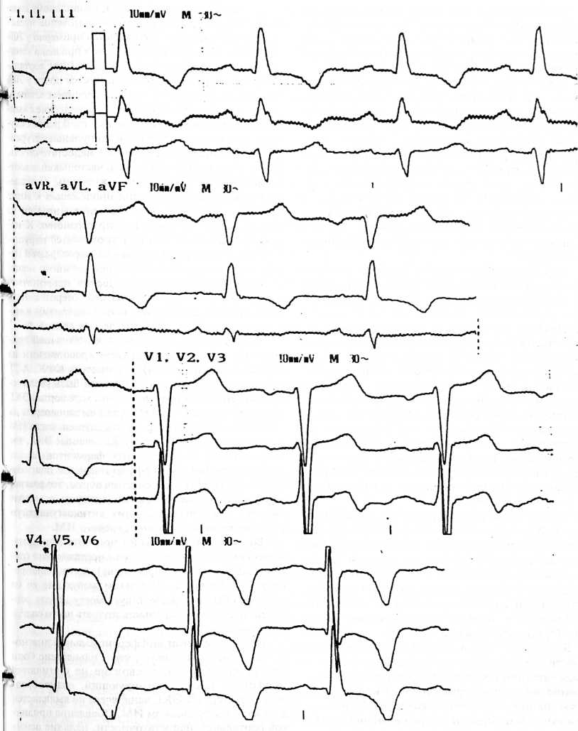 При клиническом осмотре на следующий день возникли сомнения в правильности предварительного диагноза. Изменения на ЭКГ в большей мере были характерны для одного из вариантов (по АВ. Сумарокову, 1993) гипертрофической кардиомиопатии (глубокие и остроконечные зубцы Т до 10 мм и более с пологим нисходящим началом), да и кардиоспецифические ферменты не отреагировали на болевой синдром.