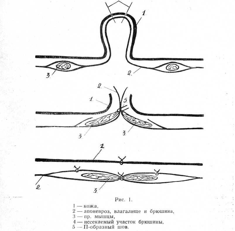 Обширный кожный рубец, покрывающий грыжевой мешок, удаляется, но, по возможности, без повреждения растянутого апоневроза и брюшины. Это осуществимо при пользовании приемом гидравлической препаровки по А. В. Вишневскому, хотя требует времени и терпения. Если средняя часть рубца прочно спаяна с апоневрозом, то ее можно удалить вместе с последним. После вскрытия брюшной полости и разделения спаек кишок с брюшиной и сальником грыжевой мешок рассекают, образуя два больших лоскута — правый и левый. Далее острым путем отпрепаровывают жировую клетчатку до краев дефекта и, несколько латеральнее медиальной комиссуры, вскрывают передний листок влагалища прямых мышц, обыкновенно отошедших далеко в стороны. После отсечения сухожильных перемычек от передних листков влагалищ и осторожного освобождения передней мышечной поверхности, подтягивают их внутренние края друг к другу. При этом необходимо сохранить связи мышц с задними листками влагалища и наружной комиссурой. Как показал наш опыт, это удается без большого труда. Теперь мышцы представляются распластанными по заднему листку. Медиальные комиссуры влагалищ или, если это не удается, латеральные полуокружности грыжевого мешка у его основания, где они рубцово утолщены, сшивают друг с другом П-образными шелковыми швами, прошивая через основания лоскутов мешка. Накладывают, смотря по величине грыжевого отверстия, от 5 до 10 швов. Таким образом, первый слой, закрывающий дефект, состоит из брюшины и пластинки задней стенки влагалища прямых мышц. Второй этаж образуют наложением П-образных швов над первым или добавляя П-образные швы на внутренние края распластанных прямых мышц, вновь проводя нитки через основание лоскутов. Мышцы сближают почти до полного соприкосновения. Полному сближению препятствуют, как сказано, основания лоскутов неудаленного грыжевого мешка. На края растянутых мышц швы должны быть наложены осторожно, без прорезывания нежных мышечных волокон и без разрывов мышечных прядей по длине, во избежание ослабить прочность живой мышечной стенки. Теперь лоскуты грыжевого мешка, обращенные брюшиной наружу (при лежачем положении больного — вверх), накладывают каждый на свою сторону на передние поверхности распластанных прямых мышц, и узловатыми кетгутовыми швами пришивают край в край, к передним листкам влагалища мышц, отошедшим далеко наружу (рис. 1). Сшивание производится без натяжения, так как пластинки лоскутов достаточно широки. При избытке лоскутов можно образовать дупликатуру, запрокинув их обратно к средине. Затем следуют кетгутовые швы на подкожную клетчатку и шелковые — на кожу. Слегка давящая повязка. Снятие швов и вставание — не раньше 11—12 дня.