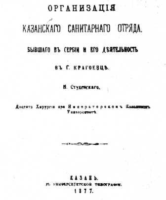 3) Н.И. Студенский. Организация Казанского санитарного отряда, бывшего в Сербии, и его деятельность в гор. Крагоевце. Казань, 1877.