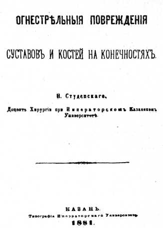- Н.И. Студенский. Огнестрельные повреждения суставов и костей на конечностях. Казань, 1881.