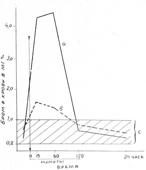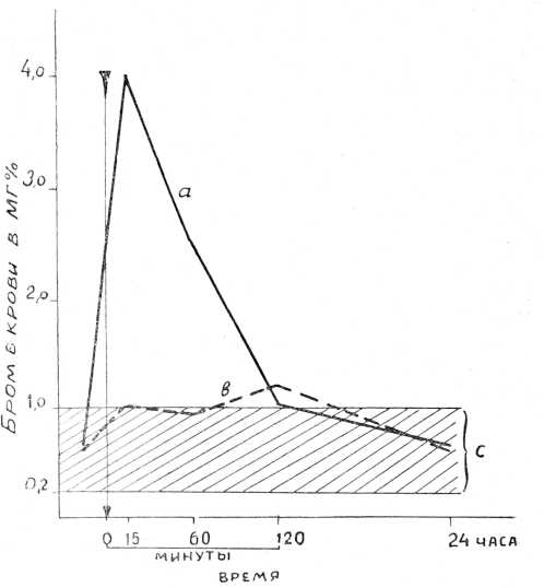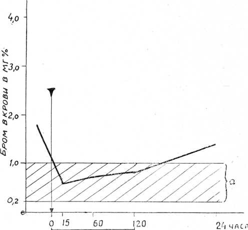 В предыдущих исследованиях нами было установлено изменение содержания брома в крови у больных под влиянием различных лечебных процедур (спинномозговая пункция, ионогальванизация головы, подкожные инъекции 10°/о раствора кофеина). Оказалось, что характер полученных „бромных кривых" соответствует индивидуальным особенностям больных. У большинства из них через 15—60 мин 14 после лечебной манипуляции отмечался значительный подъем уровня брома в крови, а спустя 2—3 часа он возвращался к первоначальным цифрам (0,20—1 ,Ожг°/о). В тех же случаях, когда исходное содержание брома было выше 1,2—1,4л/г°/о, наблюдалось его уменьшение в крови до нормы через 15—60 мин. Через 2 часа мы отмечали возвращение концентрации брома к исходному уровню (аденомы гипофиза, диэнцефальные синдромы).