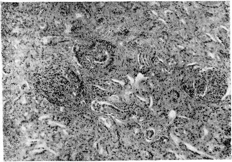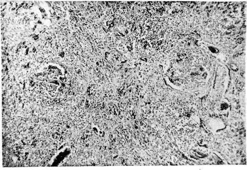 В данном случае нефрит, по-видимому, возник у больного на первых этапах заболевания (до вторичного поступления в терапевтическое отделение). Обращает на себя внимание быстрота развития процесса в почках с исходом в начинающееся сморщивание на протяжении сравнительно короткого периода времени. И в этом случае абдоминальный Синдром с бурным желудочно-кишечным кровотечением и анемизацией больного повлек за собой лапаротомию. К патологоанатомическим особенностям случая, кроме поражения почек, относятся распространенные васкулиты с фибриноидным некрозом стенки сосудов, особенно выраженные в миокарде и пищеводе; периваскулярные инфильтраты в стенке пищевода состояли преимущественно из эозинофилов, что, наряду с фибриноидным некрозом стенки сосудов, может служить указанием на аллергический характер поражения.