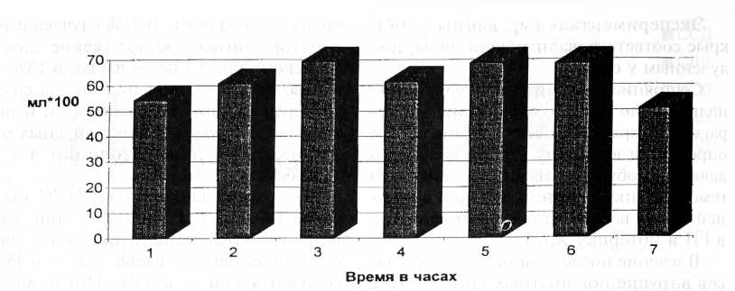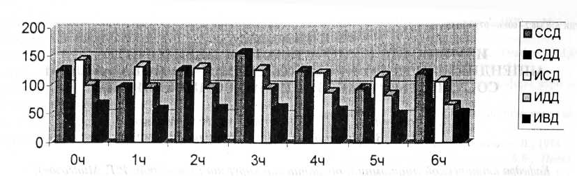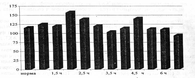 В течение последующих полутора часов в группе подопытных крыс частота дыхания сохранялась на уровне контрольной группы — 119,0±4,5 в 1 мин (103%) — Р>0,001. Через 2 часа она возросла до 156,5±2,3 в 1 мин (135%) — Р>0,001. В последующем через 3,5 часа частота дыхания снизилась до 103,0±2,6 в 1 мин (89%) — Р >0,001, через 4,5 часа возросла до 140,0±5,7 в 1 мин (121%) — Р>0,001, через 5,5 часа вновь снизилась до 111,0±3,4 в 1 мин (96%) — Р>0,001, а через 6,5 часа — до 93,0±5,0 в 1 мин (81%) — Р>0,01.