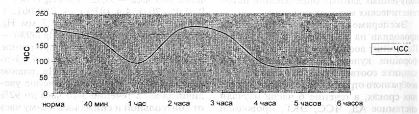 В токсической стадии ЧСС составляла 99,4±8,3 (Р>0,05) уд. в 1 мин. Расширение желудочного комплекса, смещение переходной зоны ни в одном слу- 60,1±11,8 (113%) - Р>0,05, через 2 часа - до 69,3±7,8 (123%) - Р>0,01, к 3 часам - 61,4±7,8 (114%) - Р>0,05, к 4 — 68,7±0,2 (127%) - Р>0,001, к 5 - 68,5±3,5 (126%) - Р>0,001, к 6 - 50,7±0,46 (94%) - Р>0,001.