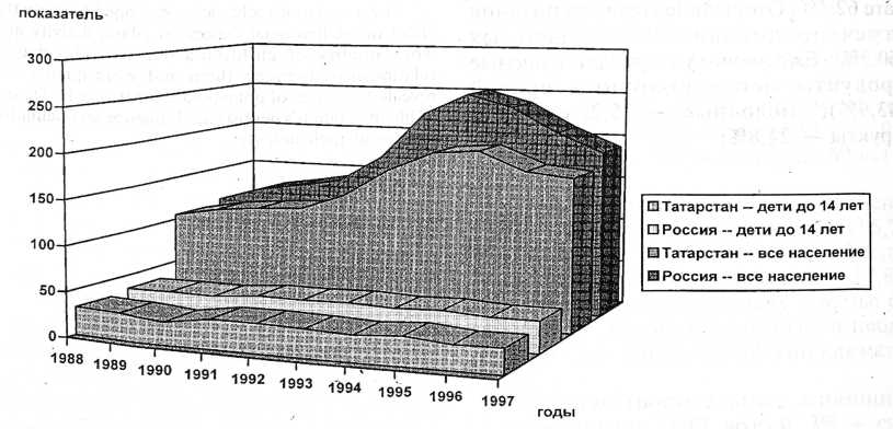 Аналогичные показатели по Республике Татарстан оказались несколько ниже среднероссийских, однако определенной тенденции в изменении показателя детской смертности от повреждений в Татарстане также не прослеживалось: в 1988 г. изучаемый показатель равнялся 30,7, а спустя 10 лет — 28,3 (на 100 тыс. соответствующего населения). В среднем за десятилетие показатель смертности детей в возрасте от 0 до 14 лет в результате неестественных причин составил 29,8 (РФ — 36,3). Среди всех умерших от несчастных случаев, травм и отравлений доля детей за указанный период уменьшилась с 7 до 3,6%, доля подростков от 15 до 19 лет фактически не изменилась.