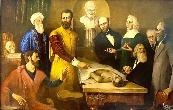 Авиценна полностью поддерживает Везалия: «Молодец! Ты прав, я давно ожидал таких открытий в анатомии, только так должна развиваться вся морфологическая наука». Н.И. Пирогов, наклонившись к Везалию, внимательно следит за движением его руки, сознавая свою ответственность перед наукой при создании нового направления в анатомии, тесно связанного с клиникой. Активно отстаивает свои идеи В. Гарвей, тщательно изучавший сердце. Спокойно, с большим достоинством он, возможно, говорит так, глядя на Галена: «Везалий прав! В вашем учении о сердце и кровообращении много ошибочного. В перегородке между желудочками в сердце нет никакого отверстия, о котором вы говорите, а кровь циркулирует по двум замкнутым кругам». Между Э.Ф. Аристовым, положившим руки на посох, и П.Ф. Лесгафтом, задумчиво стоящим прямо и опирающимся на спинку кресла, завязывается диалог. Повернувшись к Лесгафту, Аристов обращается с такими словами: «Как хорошо всё это отражено в вашем учебнике и созданном вами новом функциональном направлении в анатомии». К разговору, наклонившись, подключается В.Н. Тонков, внимательно слушая и понимая, что всё это нужно взять ему на вооружение при написании первого советского учебника по анатомии и при создании отечественной школы анатомов.
