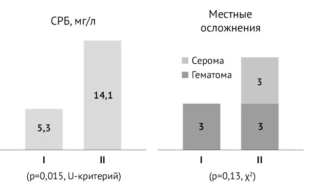 Рис. 1. Сопоставление уровня С-реактивного белка (СРБ) и местных раневых осложнений