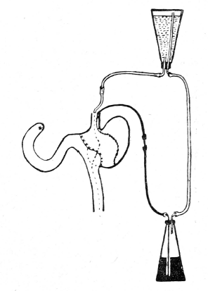 Процесс кормления и отсасывания осуществлялся при помощи двух банок Боброва, расположенных на разных уровнях по отношению к больному. Банка для кормления располагалась на 1 метр выше постели больного, банка для отсасывания помещалась на пол. По закону сообщающихся сосудов содержимое из культи желудка по типу сифона поступает в банку Боброва, помещенную ниже уровня больного. Чтобы усилить механизм отсасывания, свободные трубки в обеих пробках банок Боброва соединяли при помощи резиновой трубки. Система становилась герметичной. В начале кормления отсасывающий эффект увеличивается за счет образующегося свободного пространства в банке для кормления и заполнения его воздухом из банки для отсасывания (рис. 1). В случаях неполноценной работы этой системы отсасывание производилось через каждые 2 часа шприцем Жанэ. По мере накопления отсасываемого содержимого до 50—100 мл оно вводится шприцем в трубку для кормления. Это способствует перевариванию вводимой пищи и сохранению кислотно-щелочного, водно-солевого и электролитного равновесия в организме.