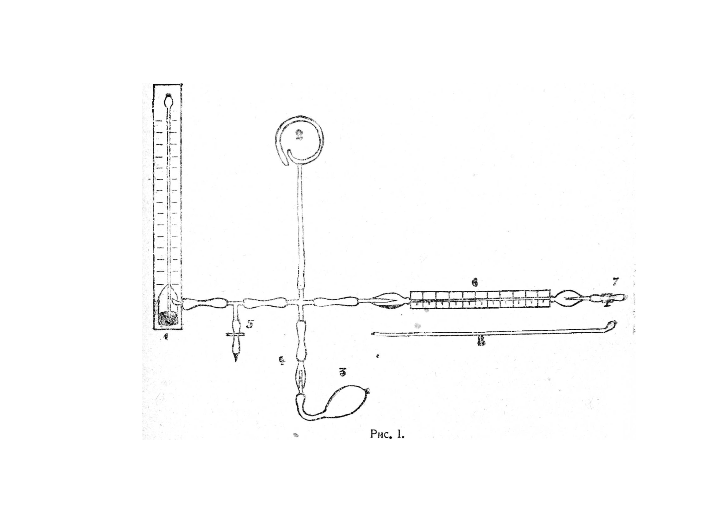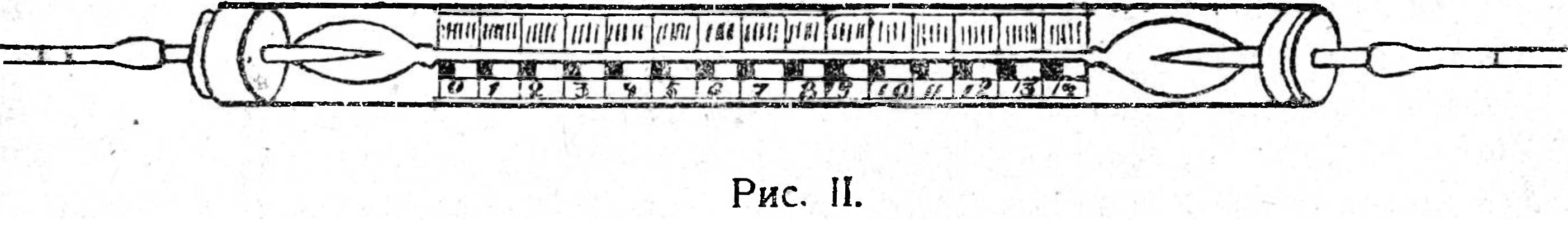 - Стеклянный капилляр с внутренним диаметром в 1 мм., длиною в 15 см„ имеющий по 2 вздутия на каждом конце: I-oe, имеющее не более 1 капли (точнее около 5 куб. мм.), II-ое, представляющее резервуар для 1—2 куб. см. подкрашенного спирта.