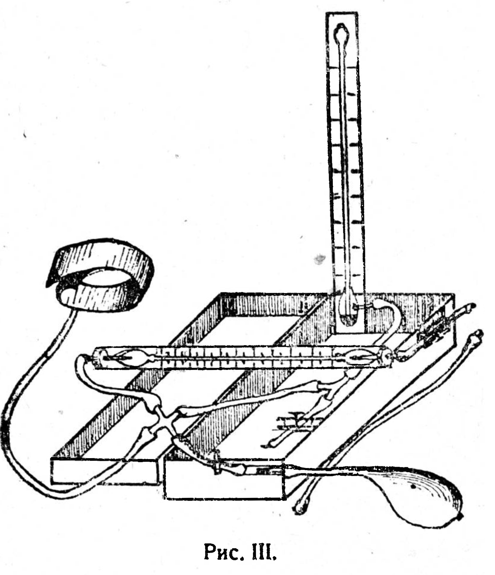 Сконструированный автором аппарат представляет осциллосфигмоманометр, который служит для измерения размаха колебаний (осцилляций) пульсовой волны и определения среднего кровяного давления. Последнему придается в настоящее время рядом авторов большое значение для оценки функционального состояния сердечно-сосудистой системы, так как среднее кровяное давление считается величиной, действительно соответствующей внутриартериальному давлению.