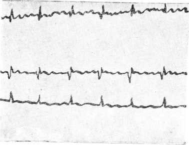 У 52 человек недостаточность кровообращения развилась на фоне давно существующей мерцательной аритмии, у 4 недостаточность кровообращения выступила с появлением мерцания. Во всех случаях была тахиаритмическая форма мерцания с частотой пульса ПО—140 и большим дефицитом (12—40).