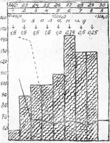 Изоланид назначался с первого — второго дней пребывания в стационаре в таблетках по 1,5—1 мг в сутки 3—4-кратными приемами или внутривенно по 0,2 мг. Начиная с третьего дня, в зависимости от полученного эффекта, соответственно доза снижалась до 1—0,75 мг в сутки, затем назначалась поддерживающая доза по 0,75— 0,5—0,25 мг. Больные, как правило, не получали другой активной терапии, кроме диеты и витаминов. Лишь при крайне тяжелом состоянии давался кислород в виде ингаляции или кислородной палатки, сосудо-тонические средства. Диуретические средства и диету Карреля назначали не раньше шестого дня тем, у кого изоланид не обеспечивал достаточного диуреза.